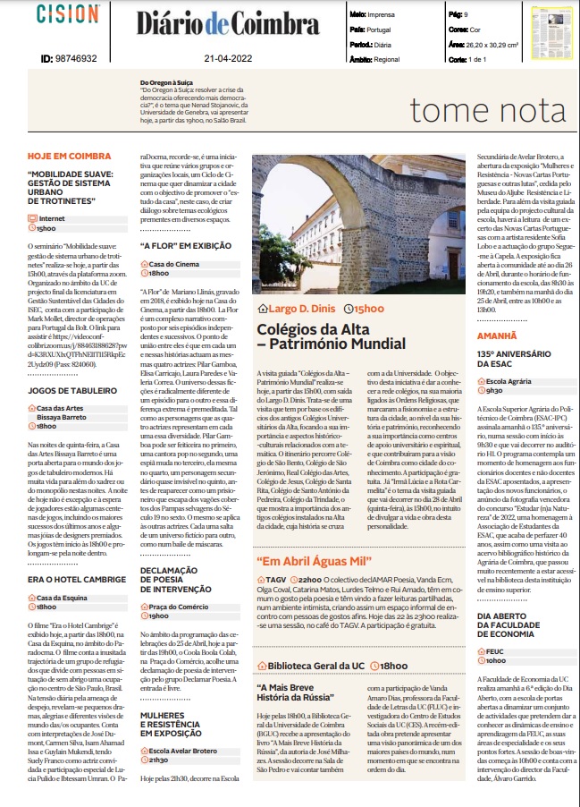 Divulgação de evento UNPOP na imprensa local (Diário de Coimbra)
